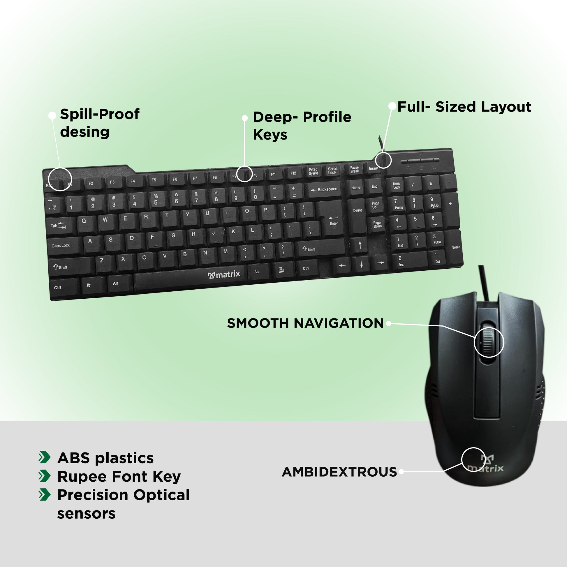 The matrix essentials combo is the perfect upgrade for your workplace. A sleek wired and efficient touch mouse is teamed with a slim designed matrix keyboard with a compact design to keep you up to date with trends. The combination is ideal for your PC because it is compatible with all PC devices. Being equipped with lengthy USB cables and a high functionality on most surfaces makes these essentials class apart.